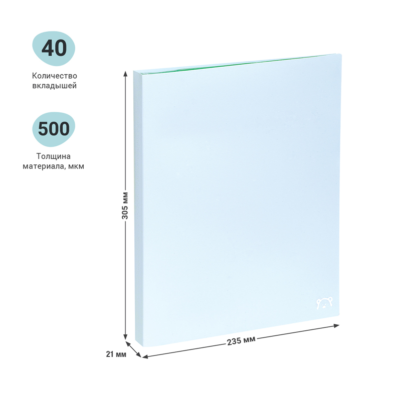 Папка с 40 вкладышами MESHU серия Dew формата А4 – это стильный аксессуар в современном дизайне нежного зеленого цвета привлекает внимание матовой, приятной на ощупь, фактурой и милым элементом в виде голографического логотипа. Папка размером 305*235*21 мм изготовлена из плотного пластика толщиной 0,5 мм с текстурой «песок» и предназначена для транспортировки, упорядочивания и хранения бумаг. Ширина корешка 21 мм, тип скрепления: термосварка. Вкладыши защищают документы от повреждений и загрязнений. Индивидуальная упаковка в пакет. Создать эффектный канцелярский набор в дополнение к папке помогут другие товары MESHU из серии Dew.