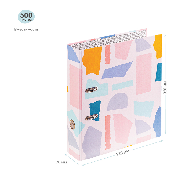 Папка–регистратор MESHU серия Pastel colors формата А4 с арочным механизмом выполнены из жесткого картона с покрытием из плотной офсетной бумаги. Вместимость папки – 500 листов, ширина корешка – 70 мм, размер папки 290*320*70 мм. Актуальный привлекательный дизайн одинаково подойдет как для офисного, так и домашнего интерьера. Пастельные фигуры на белом фоне. Конструкция разработана с учетом всех особенностей эксплуатации. Специальные прорези фиксируют папку в закрытом положении, предохраняя от непроизвольного открывания. Кольцо-захват на торце папки для удобства извлечения с полки. В упаковке 2 штуки. <br/>• Вместимость, в листах: 500;<br/>• Формат: А4;<br/>• Цвет: разноцветный;<br/>• Ширина корешка: 70 мм.