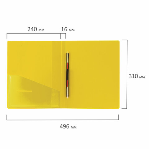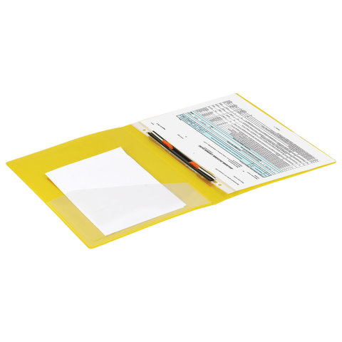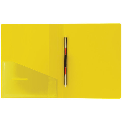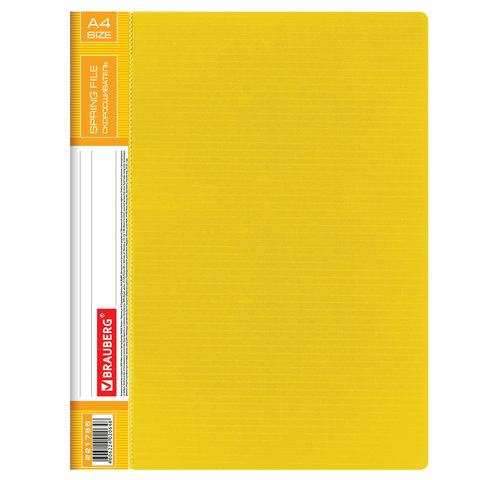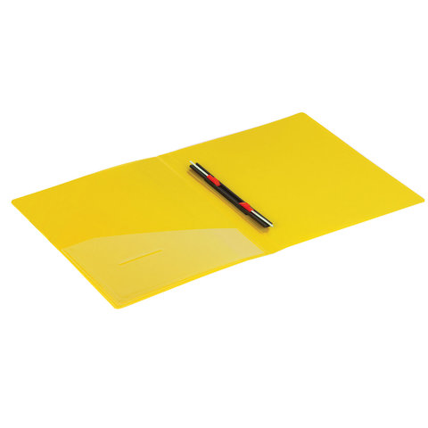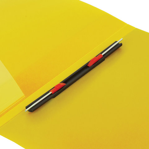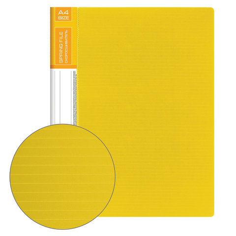 Изготовлена из высококачественного пластика желтого цвета толщиной 0,7 мм с оригинальной линейной фактурой. Обеспечивает хранение до 100 листов формата А4. Металлический скоросшиватель с пружинным механизмом обеспечит надежную фиксацию документов. Кроме того, папка снабжена прозрачным внутренним карманом. Для идентификации имеется сменный бумажный корешок. Поставляется в индивидуальной упаковке.