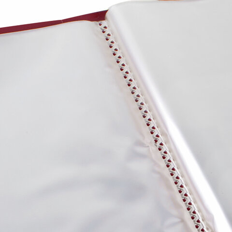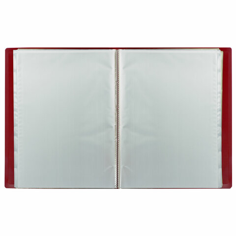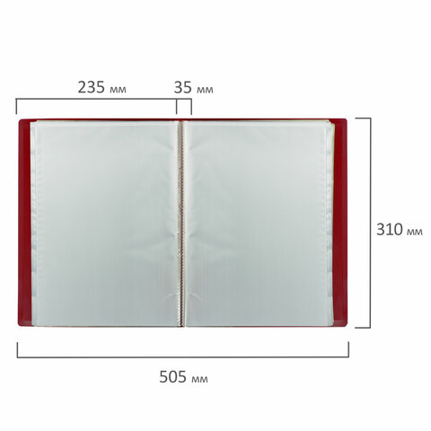 Для маркировки содержимого на корешок наклеена этикетка. Папка изготовлена из качественного пластика толщиной 0,8 мм с антибликовой фактурой, а ширина корешка составляет 35 мм. Содержит 100 вкладышей, позволяющих хранить документы формата А4 и обеспечивающих их надежную защиту от попадания влаги, пыли и прочих повреждений.