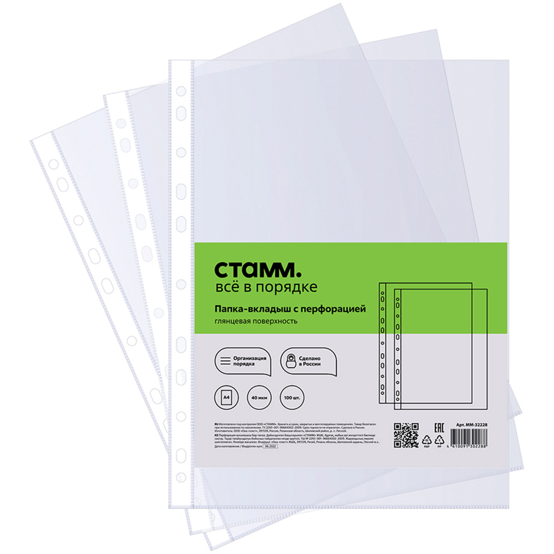 УЦЕНКА - Папка-вкладыш с перфорацией (файл) СТАММ А4, 40мкм, глянцевая
