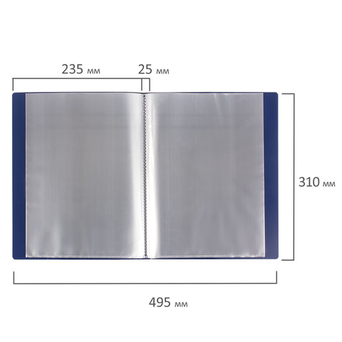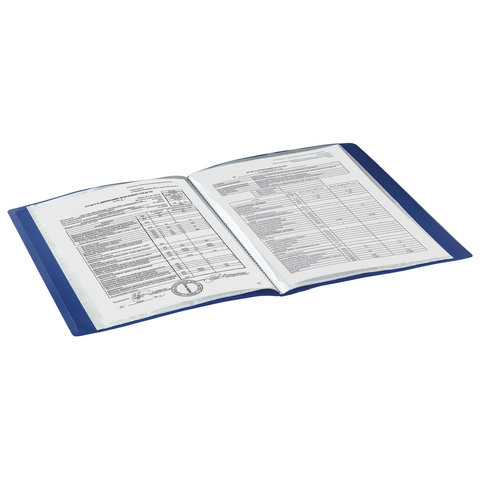 На корешке имеется карман для маркировки содержимого. Папка изготовлена из качественного пластика толщиной 0,7 мм с антибликовой линейной фактурой, а ширина корешка составляет 25 мм. Содержит 40 антибликовых вкладышей, позволяющих хранить документы формата А4 и обеспечивающих их надежную защиту от попадания влаги, пыли и прочих повреждений. Поставляется в индивидуальной упаковке.