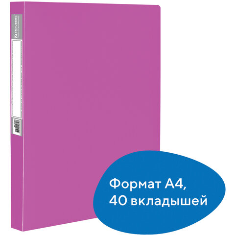 Для маркировки содержимого на корешок наклеена этикетка. Папка изготовлена из качественного пластика толщиной 0,7 мм с антибликовой фактурой, а ширина корешка составляет 25 мм. Содержит 40 вкладышей, позволяющих хранить документы формата А4 и обеспечивающих их надежную защиту от попадания влаги, пыли и прочих повреждений. Поставляется в индивидуальной упаковке.