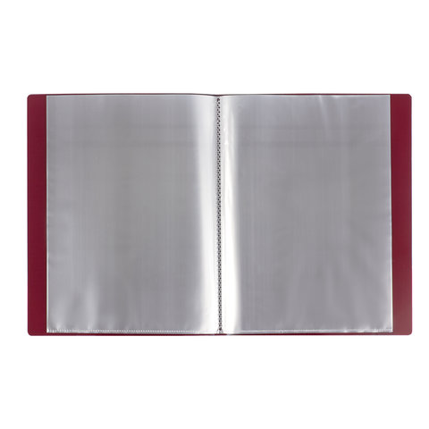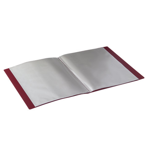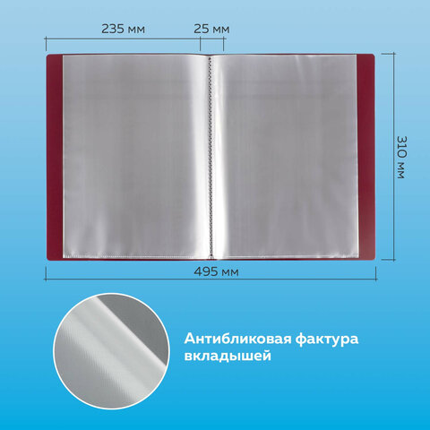 На корешке имеется карман для маркировки содержимого. Папка изготовлена из качественного пластика толщиной 0,7 мм с антибликовой фактурой, а ширина корешка составляет 25 мм. Содержит 40 вкладышей, позволяющих хранить документы формата А4 и обеспечивающих их надежную защиту от попадания влаги, пыли и прочих повреждений. Поставляется в индивидуальной упаковке.