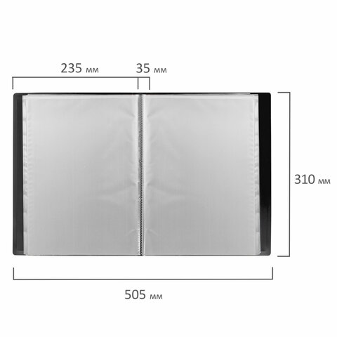 Для маркировки содержимого на корешок наклеена этикетка. Папка изготовлена из качественного пластика толщиной 0,8 мм с антибликовой фактурой, а ширина корешка составляет 35 мм. Содержит 80 вкладышей, позволяющих хранить документы формата А4 и обеспечивающих их надежную защиту от попадания влаги, пыли и прочих повреждений.