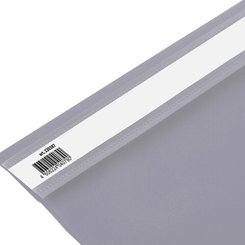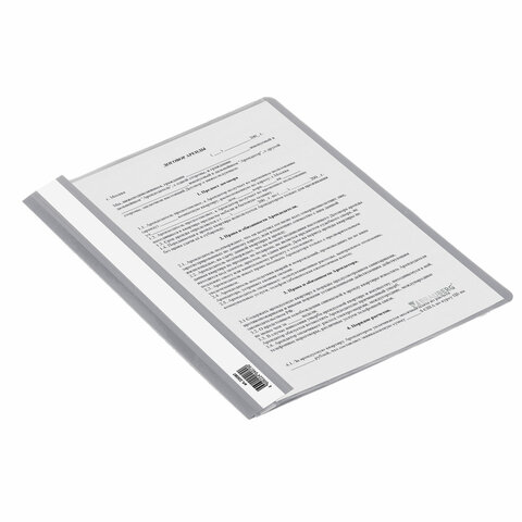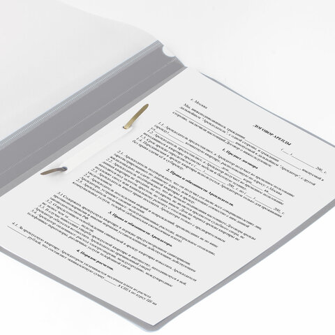 Фиксирует до 100 листов формата А4. Толщина пластика верхнего листа составляет 130 мкм, а нижнего - 180 мкм. Предельно простой механизм подшивки: металлические усики и пластиковая планка для надежной фиксации документов. Скоросшиватель изготовлен из качественного полипропилена. Прозрачный верхний лист позволяет определить содержимое, не открывая скоросшиватель, который к тому же снабжен сменным пластиковым корешком, что дает возможность структурировать информацию. Благодаря фактуре "песок" и строгому серому цвету обложки папка никогда не затеряется на полке.