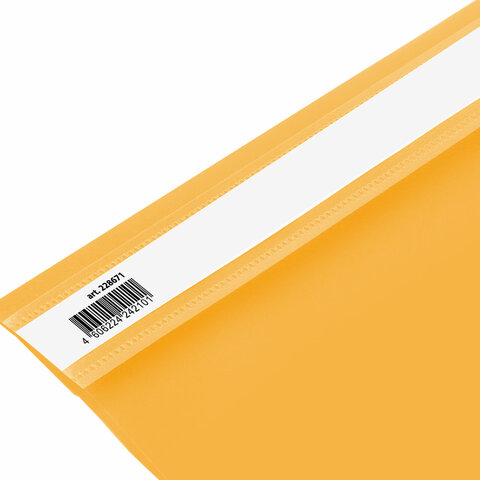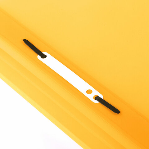 Фиксирует до 100 листов формата А4. Толщина пластика для верхнего листа - 130 мкм, для нижнего - 180 мкм. Предельно простой механизм подшивки: металлические усики и пластиковая планка для надежной фиксации документов. Скоросшиватель изготовлен из полипропилена. Снабжен прозрачным верхним листом. Для идентификации имеет сменный пластиковый корешок. Благодаря фактуре "песок" и яркому желтому цвету обложки важная папка никогда не затеряется на полке.