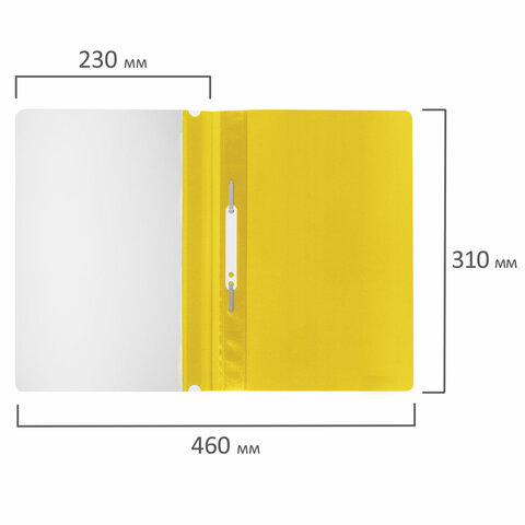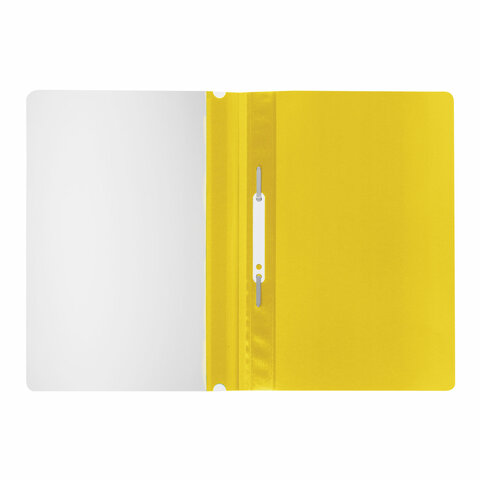 Фиксирует до 100 листов формата А4. Толщина пластика верхнего листа составляет 100 мкм, а нижнего - 120 мкм. Предельно простой механизм подшивки: металлические усики и пластиковая планка для надежной фиксации документов. Скоросшиватель изготовлен из качественного полипропилена. Прозрачный верхний лист позволяет определить содержимое, не открывая скоросшиватель, который к тому же снабжен сменным пластиковым корешком, что дает возможность структурировать информацию. Благодаря гладкой фактуре и яркому желтому цвету обложки папка никогда не затеряется на полке.