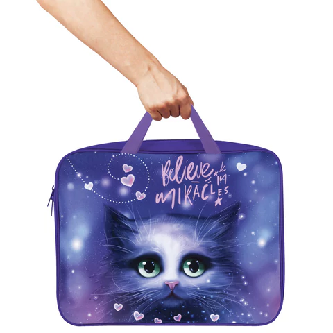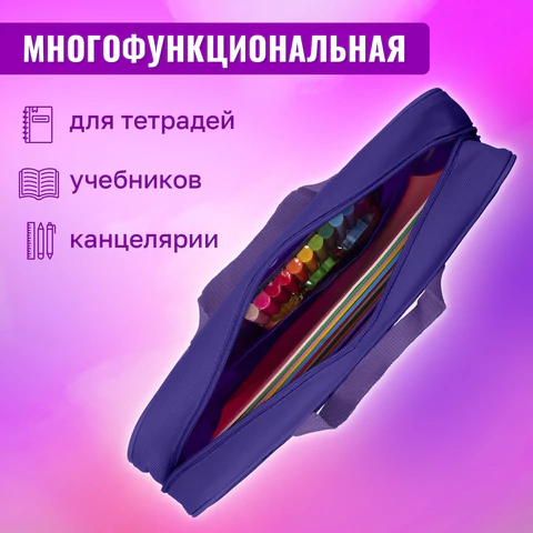 Папка для тетрадей формата А4 с ручками для переноски изготовлена из прочного полиэстера. Внутри одно отделение, застегивается на молнию по верхнему краю.