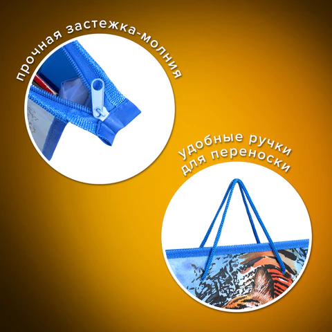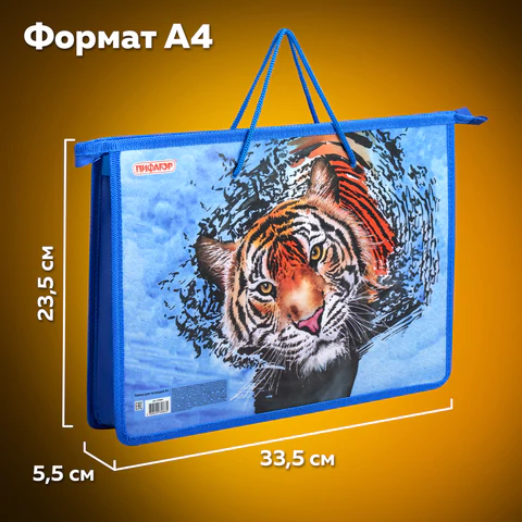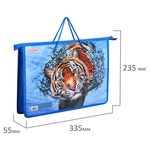 Размер папки – 335х235 мм, ширина – 55 мм. Широкий формат товара позволяет разместить большое количество канцелярских принадлежностей для творчества внутри. Папка имеет удобную застежку-молнию сверху. Ручки, изготовленные из шнурка, способствуют комфортной переноске при большой нагрузке.