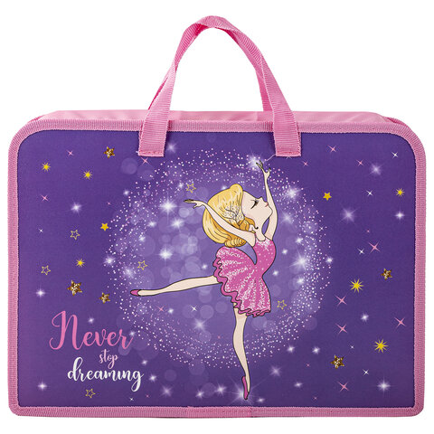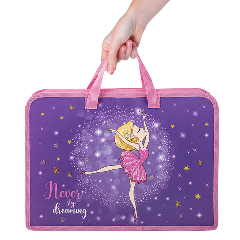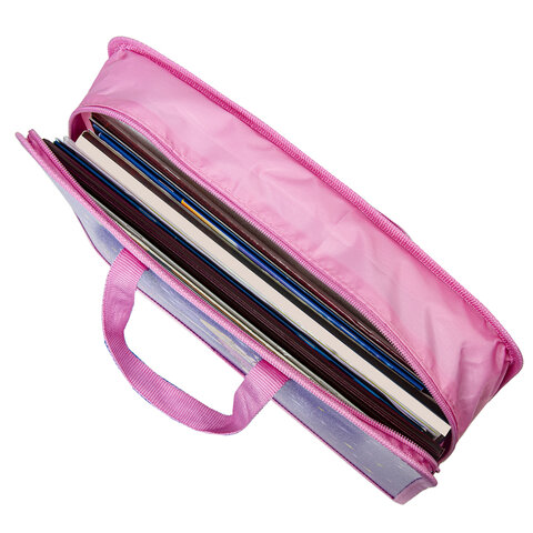 Размер папки – 325х230 мм, ширина – 80 мм. Широкий формат товара позволяет разместить большое количество канцелярских принадлежностей для творчества внутри, в том числе стакан-непроливайку. Папка имеет удобную застежку-молнию сверху. Прочные ручки с надежным креплением к папке, изготовленные из тесьмы, способствуют комфортной переноске при большой нагрузке.