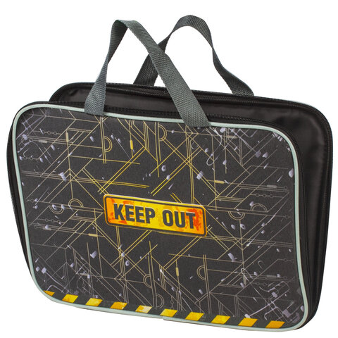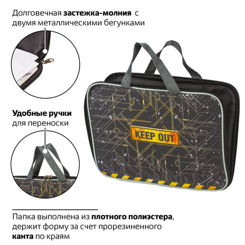 Папка для тетрадей BRAUBERG "Keep Out" формата А4 с ручками для переноски. Изготовлена из плотного полиэстера с подкладкой внутри. Одно отделение. Застегивается на молнию. Папка держит форму за счет прорезиненного канта по краям. Яркая цветная печать.