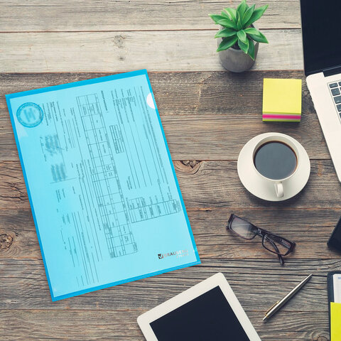 Папка формата А4 выполнена из высококачественного полипропилена плотностью 150 мкм. Она предотвращает смятие, загрязнение или намокание бумаг. Прозрачный материал позволяет увидеть содержимое, не открывая папку. Специальная выемка для перелистывания листов облегчает работу с документами. Данная папка заметно выделяется среди других благодаря насыщенному синему цвету.