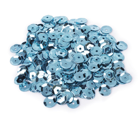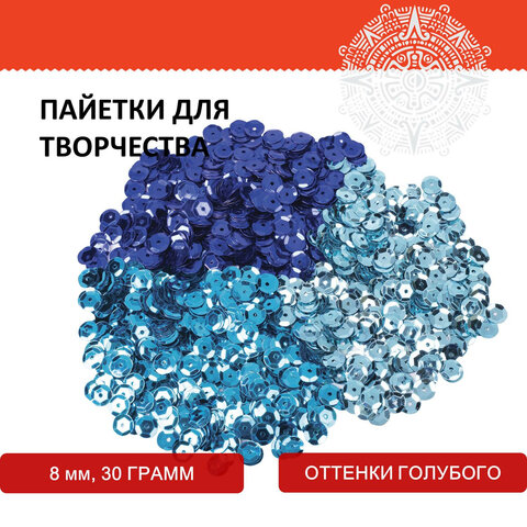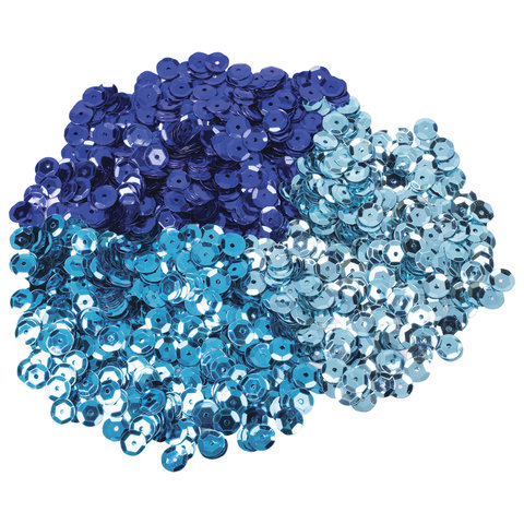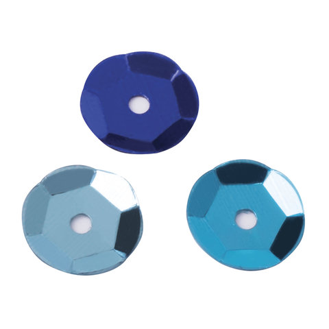 Изготовлены из высококачественного пластика. Представлены 3 оттенка голубого с фольгированным эффектом. Пайетки классической круглой формы с шестигранной огранкой. Оснащены отверстием для нити в центре. Предназначены для детей от 3 лет. Диаметр - 8 мм. Вес - 30 г. Поставляются в пакете с европодвесом.