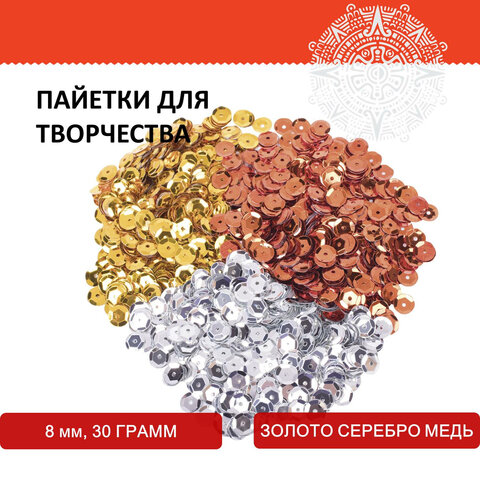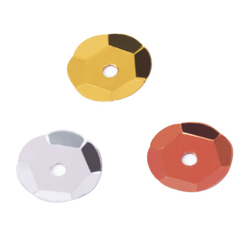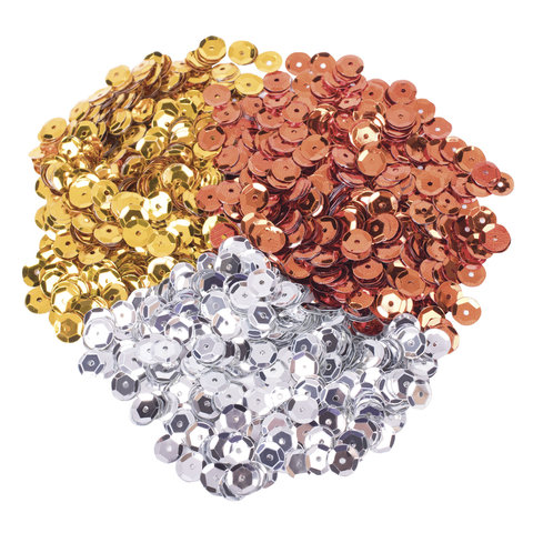 Изготовлены из высококачественного пластика. Представлены 3 металлических оттенка. Пайетки классической круглой формы с шестигранной огранкой. Оснащены отверстием для нити в центре. Предназначены для детей от 3 лет. Диаметр - 8 мм. Вес - 30 г. Поставляются в пакете с европодвесом.