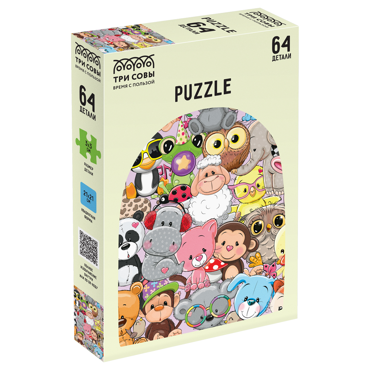 Пазл «ТРИ СОВЫ» «Мягкие игрушки» из 64 элементов станет отличным способом весело провести вечер. Картинка имеет квадратную форму, в собранном виде размер составляет 21*21 см. Пазлы упакованы в прочную красивую коробку и станут отличным подарком! Изготовлены в России.<br/>Пазлы «ТРИ СОВЫ» – это большой выбор иллюстраций, яркие и четкие цвета и высокий уровень полиграфии. Пазлы изготовлены из плотного специализированного картона, который обеспечивает высокую сцепку деталей. Процесс сборки головоломки будет увлекателен для всей семьи и поможет провести время интересно и с пользой – занятие способствует развитию образного и логического мышления, памяти и мелкой моторики. <br/>• Количество элементов: 64;<br/>• Размер в собранном виде: 21*21 см;<br/>• Форма: квадратная.
