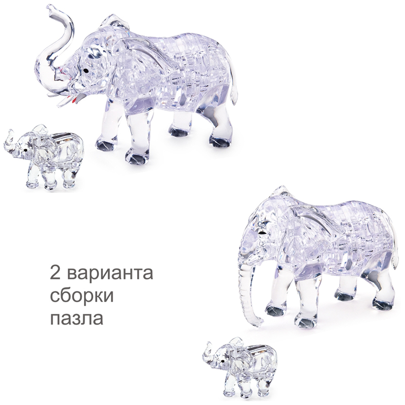 В этом наборе от Crystal puzzle вас ожидает не одна, а сразу две фигурки! Соберите милую парную композицию из 46 деталей слона со слоненком. Вам предстоит правильно подобрать детали по форме и размеру, найти для каждой свое место. Особенность этого 3D-пазл состоит в том, что собирать фигурки придется в трехмерном пространстве, учитывая объем и рельефную поверхность.<br/><br/>Детали сделаны из полупрозрачного пластика, который красиво смотрится под различными источниками света. Детям такие объемные головоломки нравятся за необычные правила сборки, возможность решить задачу разными способами и красивый результат.<br/><br/>В комплекте: 46 деталей пазла, инструкция на русском языке<br/><br/>Возраст: 12+