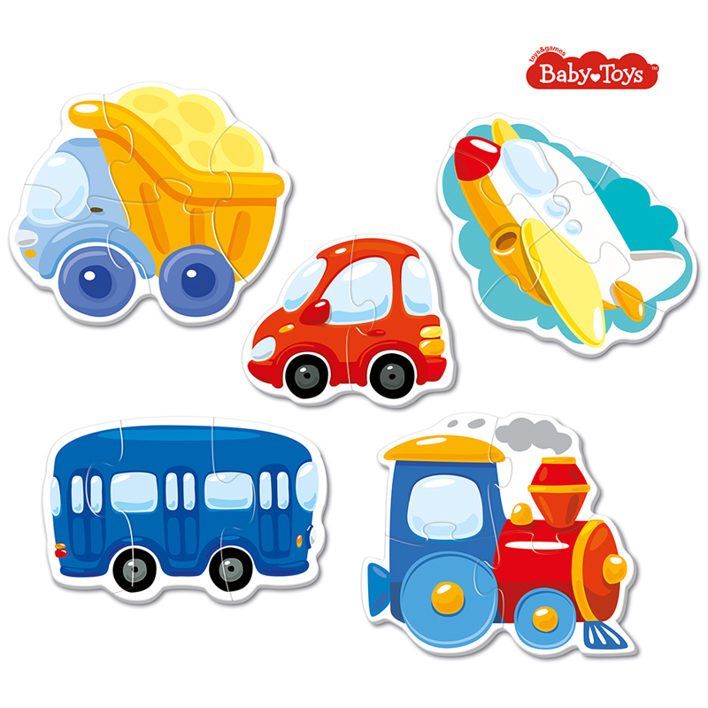 Контурные фигурные пазлы «Транспорт» от Baby Toys. 3+. Состав набора: пазл-автобус из 3-х частей – 1 шт. (размер в собранном виде – 16 х 10 см); пазл-паровоз из 4-х частей – 1 шт. (размер в собранном виде – 14 х 14 см); пазл-машинка из 2-х частей – 1 шт. (размер в собранном виде – 12 х 10 см); пазл-самолёт из 4-х частей – 1 шт. (размер в собранном виде – 16 х 11 см); пазл-грузовик из 5-и частей – 1 шт. (размер в собранном виде – 16 х 14 см). Всего в наборе 5 фигурных пазлов на уникальном пазловом замке. Материал: плотный многослойный картон толщиной 2 мм с односторонней ламинацией с лицевой стороны. Развивает интеллект, логику, мелкую моторику и речь.