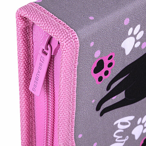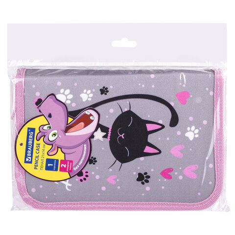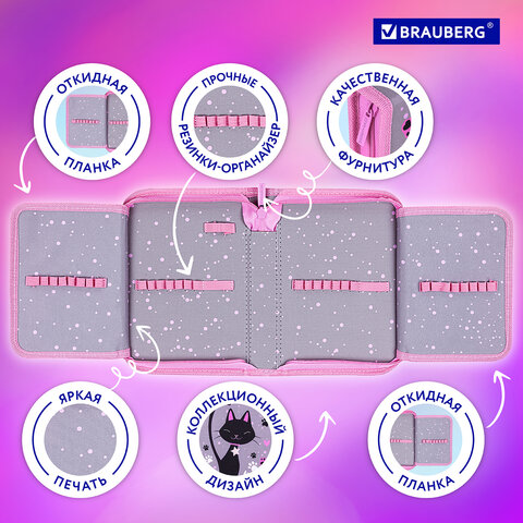 Тканевый пенал BRAUBERG стандартного размера с одним отделением и двумя откидными планками. Удобная молния с трех сторон с металлическим бегунком, прочные резинки для предметов. Внутри пенала - цветная печать. Вмещает до 35 предметов.