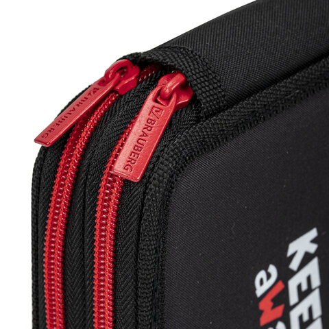 Тканевый пенал BRAUBERG "Keep Away" стандартного размера с двумя отделениями. Удобная молния с трех сторон с металлическим бегунком, прочные резинки для предметов. Внутри пенала - цветная печать. Вмещает до 25 предметов.