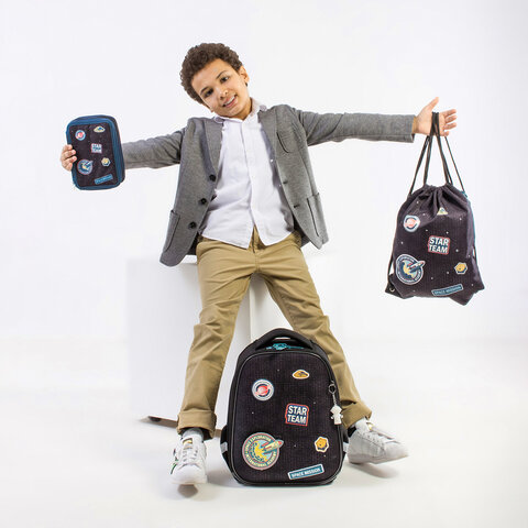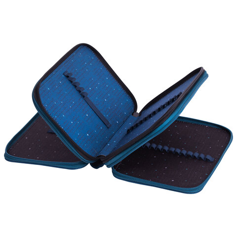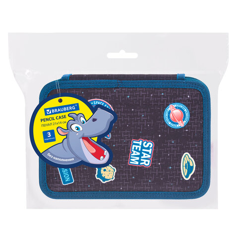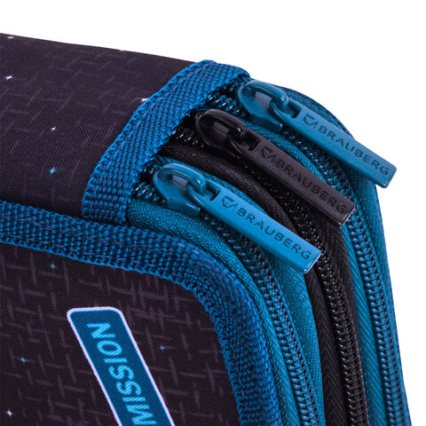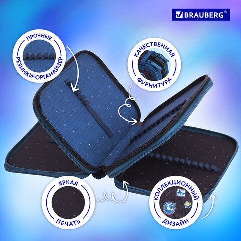 Тканевый пенал BRAUBERG "Space mission" стандартного размера с тремя отделениями. Удобная молния с трех сторон с металлическим бегунком, прочные резинки для предметов. Внутри пенала - цветная печать. Вмещает до 46 предметов.