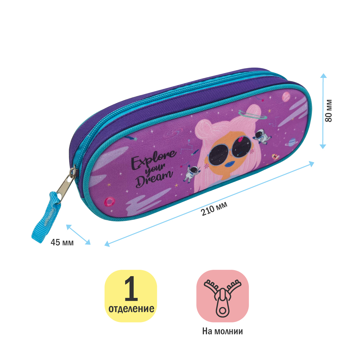 Пенал-футляр для девочки ArtSpace Dream – отличный помощник в учёбе. Изделие размера 210*80*45 мм имеет одно отделение, закрывающееся на молнию. Модель выполнена из полиэстера сиреневого цвета с ярким рисунком. Удобный школьный пенал для хранения письменных и чертежных принадлежностей непременно понравится девочкам. Упакован в индивидуальный пакет. Поставляется без наполнения.<br/>• Материал: полиэстер;<br/>• Количество отделений: 1;<br/>• Тип пенала: на молнии;<br/>• Размер: 210*80*45 мм.