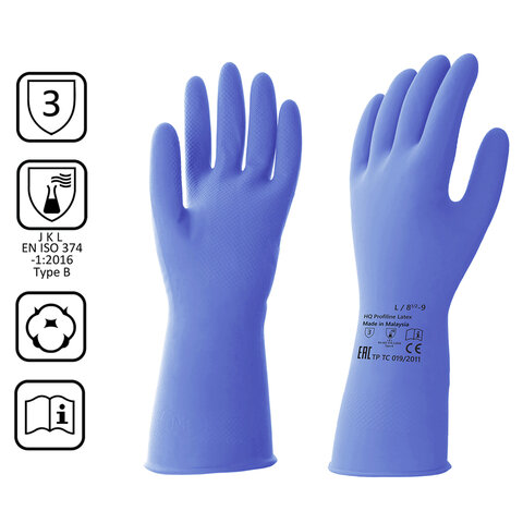 Перчатки латексные КЩС, сверхпрочные, плотные, хлопковое напыление, размер 8,5-9 L, большой, синие, HQ Profiline, 74735