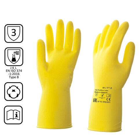 Перчатки латексные КЩС, сверхпрочные, плотные, хлопковое напыление, размер 7,5-8 M, средний, желтые, HQ Profiline, 73584