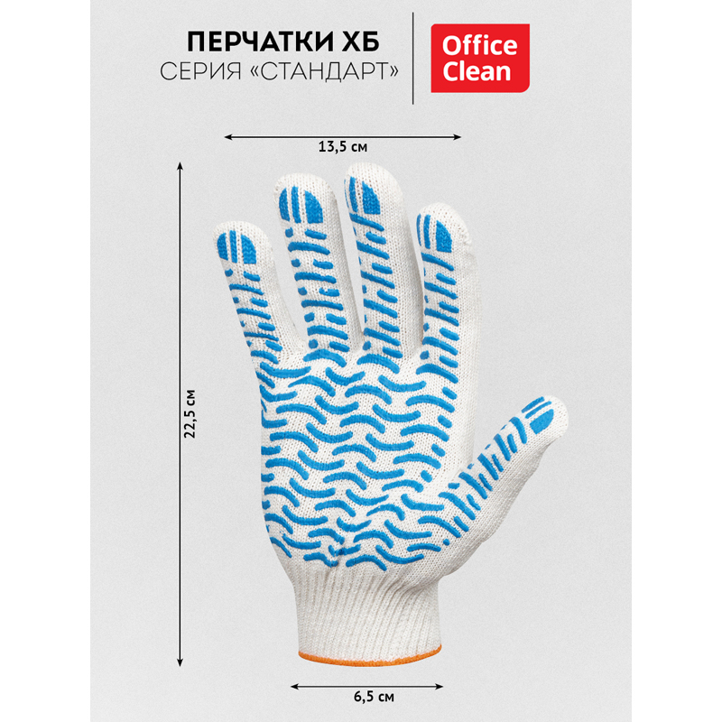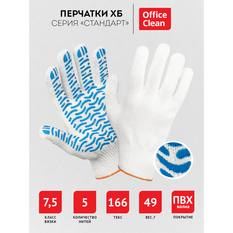 Хлопчатобумажные перчатки OfficeClean удобны в применении на производстве, в быту, в садоводстве, на автосервисах, при строительно-ремонтных работах. Перчатки х/б с ПВХ напылением в отличии от обычных перчаток хб, достаточно износостойкие и долговечные, в них удобно работать в любых условиях, так как такая поверхность не позволяет руке скользить и значительно повышает уровень защиты от повреждений.<br/>Перчатки OfficeClean изготовлены из хлопчатобумажной пряжи плотностью 166 текс, 5 нитей, с ПВХ покрытием "Волна". Манжеты перчаток сделаны в виде резинок, которые обеспечивают плотное прилегание перчаток к рукам. Перчатки белого цвета, 7,5-ой класс вязки. Вес пары: 48-50 г. Поставляются в комплекте 10 пар/20 шт. в полиэтиленовом пакете.<br/>Основные характеристики х/б перчаток и их значение:<br/>1. текс или линейная плотность нити.<br/>Текс (от лат. texo — ткать) — единица толщины или плотности нити, измеряется в граммах на километр. Текс 166 означает, что один километр этой нити весит 166 грамма. <br/>2. число нитей и вес перчатки.<br/>При выборе перчаток большее значение имеет вес пары. Связать пару перчаток можно из одной толстой нити тексом 250 или четырёх тонких нитей тексом 62. В результате получаются одинаковые по весу и прочности перчатки.<br/>3. класс вязки.<br/>Класс вязки обозначает количество петель на дюйм. У перчаток 7 класса вязки семь петель на дюйм. Для увеличения класса вязки уменьшают толщину пряжи, поэтому чем выше класс вязки, тем больше плотность и меньше вес перчаток.<br/>7 или 7,5 класс – обычная плотность вязки: 7 или 7,5 петель на дюйм. Перчатки этого класса толще и тяжелее чем перчатки более высоких классов. Обеспечивают повышенную защиту от механических повреждений при грубых и трудных роботах. Основными потребителями являются крупные промышленные предприятия.<br/>10 класс – повышенная плотность вязки: 10 петель на дюйм. Вязка более высоко плотности обеспечивает лучшую защиту рук от производственных загрязнений. Использование нити малой толщины сохраняет высокую чувствительность рук для проведения тонких работ.<br/>13 класс – очень высокая плотность вязки: 13 петель на дюйм. Такая плотность плетения делает эти перчатки пригодными для высокоточных работ на предприятиях электронной промышленности и других отраслях, где имеет важность высокая чувствительность пальцев рук. Благодаря дополнительному латексному покрытию достигается повышенная устойчивость к истиранию.<br/>4. оверлок манжеты.<br/>На манжетах перчаток делают оверлок, чтобы они не распускались. Распущенные нитки манжеты портят внешний вид и приводят к травмам, попадая в движущиеся элементы механизмов.<br/>5. защитное ПВХ покрытие ладони.<br/>Защитный ПВХ слой "Точка", "Волна", "Протектор" или любой другой рисунок увеличивает трение, а значит сцепление перчаток с поверхностью, и уменьшает истирание рабочих перчаток, что продлевает срок службы.<br/>В перчатках х/б OfficeClean Ваши руки всегда под надежной защитой.
