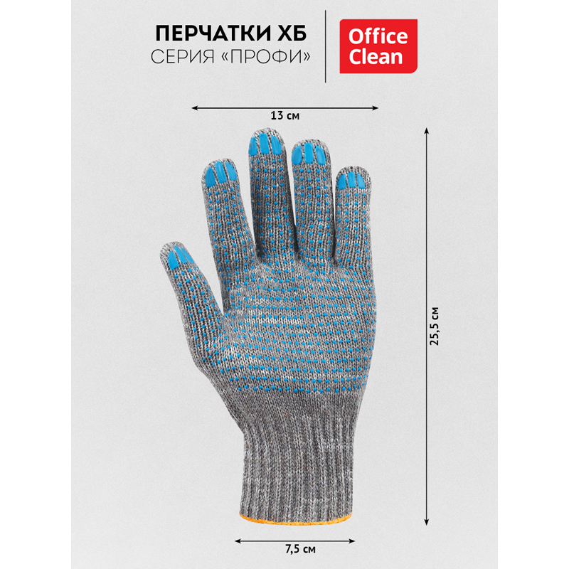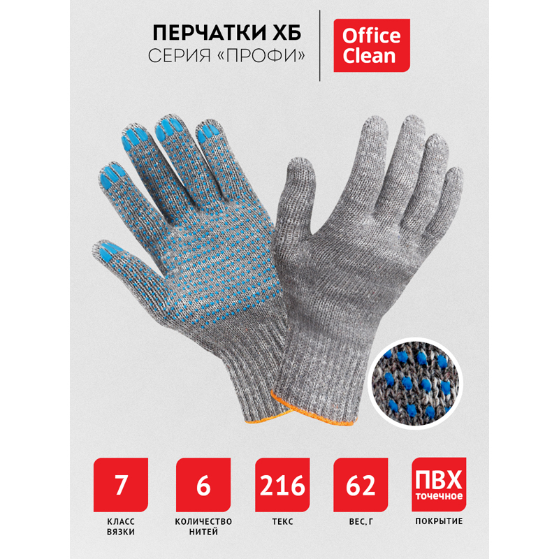 Хлопчатобумажные перчатки OfficeClean удобны в применении на производстве, в быту, в садоводстве, на автосервисах, при строительно-ремонтных работах. Перчатки х/б с ПВХ напылением в отличии от обычных перчаток хб, достаточно износостойкие и долговечные, в них удобно работать в любых условиях, так как такая поверхность не позволяет руке скользить и значительно повышает уровень защиты от повреждений.<br/>Перчатки OfficeClean изготовлены из хлопчатобумажной пряжи плотностью 216 текс, 6 нитей, с точечным ПВХ покрытием. Манжеты перчаток сделаны в виде резинок, которые обеспечивают плотное прилегание перчаток к рукам. Перчатки изготовлены в цвете меланж, 7-ой класс вязки. Вес пары: 61-63 г. Поставляются в комплекте 10 пар/20 шт. в полиэтиленовом пакете.<br/>Основные характеристики х/б перчаток и их значение:<br/>1. текс или линейная плотность нити.<br/>Текс (от лат. texo — ткать) — единица толщины или плотности нити, измеряется в граммах на километр. Текс 216 означает, что один километр этой нити весит 216 грамма. <br/>2. число нитей и вес перчатки.<br/>При выборе перчаток большее значение имеет вес пары. Связать пару перчаток можно из одной толстой нити тексом 250 или четырёх тонких нитей тексом 62. В результате получаются одинаковые по весу и прочности перчатки.<br/>3. класс вязки.<br/>Класс вязки обозначает количество петель на дюйм. У перчаток 7 класса вязки семь петель на дюйм. Для увеличения класса вязки уменьшают толщину пряжи, поэтому чем выше класс вязки, тем больше плотность и меньше вес перчаток.<br/>7 или 7,5 класс – обычная плотность вязки: 7 или 7,5 петель на дюйм. Перчатки этого класса толще и тяжелее чем перчатки более высоких классов. Обеспечивают повышенную защиту от механических повреждений при грубых и трудных роботах. Основными потребителями являются крупные промышленные предприятия.<br/>10 класс – повышенная плотность вязки: 10 петель на дюйм. Вязка более высоко плотности обеспечивает лучшую защиту рук от производственных загрязнений. Использование нити малой толщины сохраняет высокую чувствительность рук для проведения тонких работ.<br/>13 класс – очень высокая плотность вязки: 13 петель на дюйм. Такая плотность плетения делает эти перчатки пригодными для высокоточных работ на предприятиях электронной промышленности и других отраслях, где имеет важность высокая чувствительность пальцев рук. Благодаря дополнительному латексному покрытию достигается повышенная устойчивость к истиранию.<br/>4. оверлок манжеты.<br/>На манжетах перчаток делают оверлок, чтобы они не распускались. Распущенные нитки манжеты портят внешний вид и приводят к травмам, попадая в движущиеся элементы механизмов.<br/>5. защитное ПВХ покрытие ладони.<br/>Защитный ПВХ слой "Точка", "Волна", "Протектор" или любой другой рисунок увеличивает трение, а значит сцепление перчаток с поверхностью, и уменьшает истирание рабочих перчаток, что продлевает срок службы.<br/>В перчатках х/б OfficeClean Ваши руки всегда под надежной защитой.