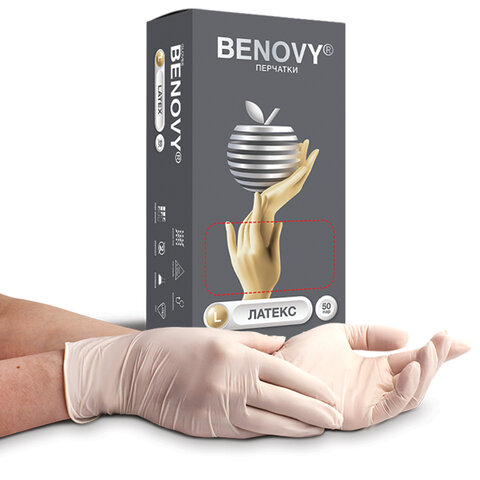 Перчатки латексные смотровые 50 пар (100 шт.), размер L (большой), BENOVY Latex Chlorinated, 21529
