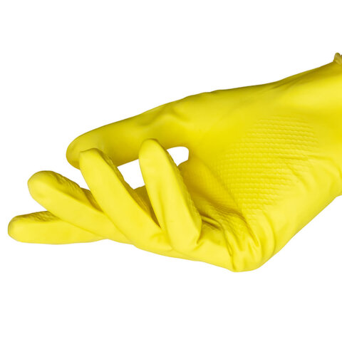Выполнены из латекса желтого цвета с хлопковым внутренним напылением. Обладают рельефной поверхностью. Размер - XL.