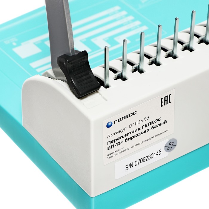 Брошюровщик для пластиковой пружины, перфорация 9 листов, переплетения 170 листов "Гелеос БП-9+", бирюзово-белый