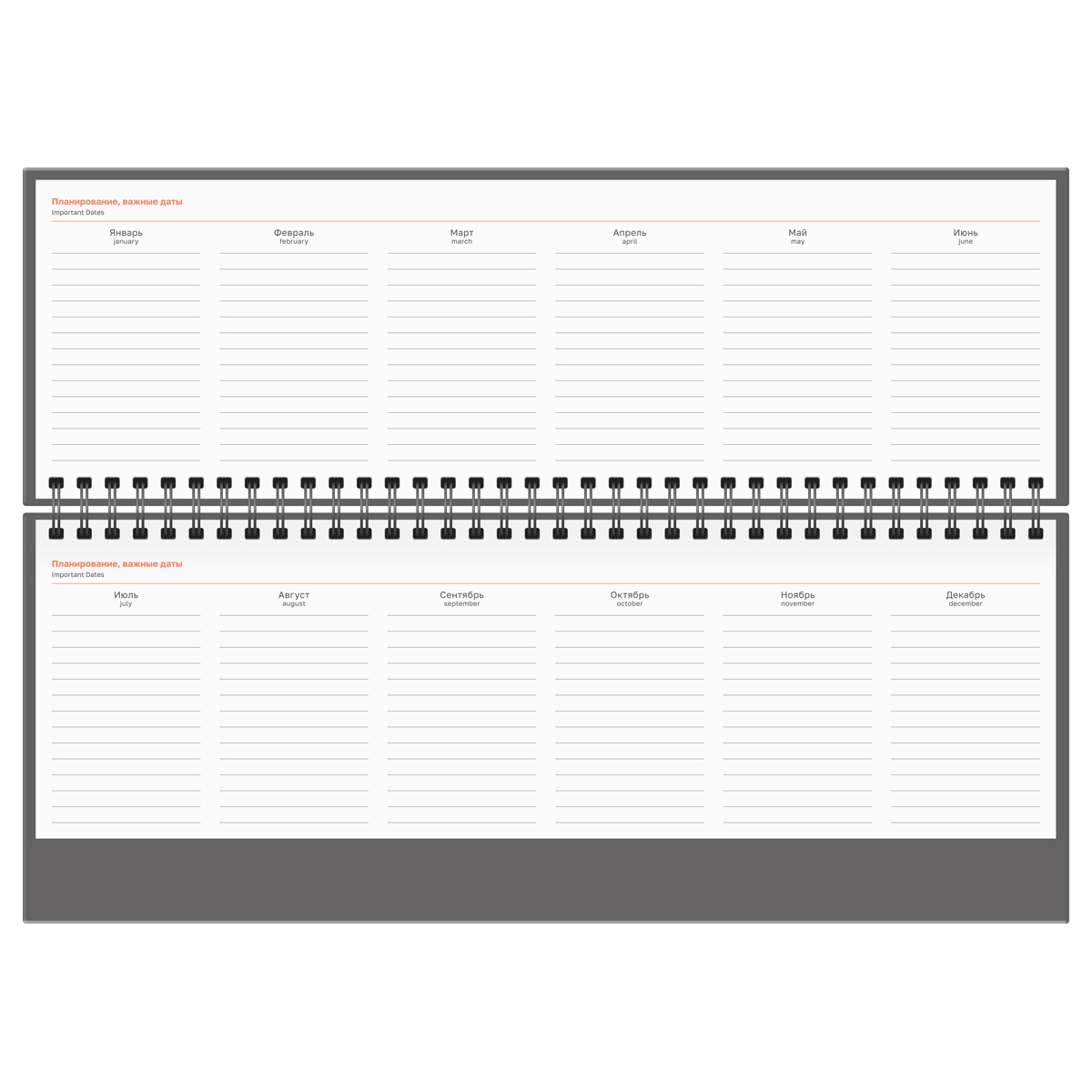 Планинг содержит календарные разделы на каждый месяц с датами и праздниками, чтобы вы не пропустили ни одной важной даты или события. Кроме блоков для важных задач и заметок, он включает телефонную книгу и календарь на четыре года.