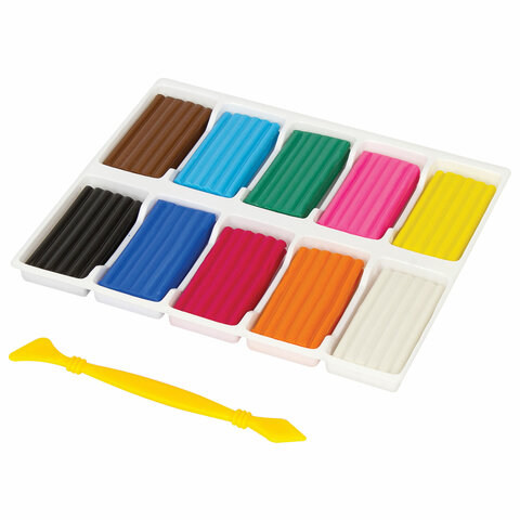 Масса набора - 250 г. В него входит 10 брусков по 25 г разных цветов: белый, оранжевый, малиновый, синий, черный, коричневый, розовый, зеленый, голубой, желтый. Со стеком.