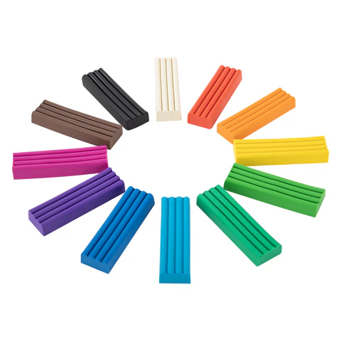 В составе набора 12 брусков по 20 г разных цветов: белый, черный, синий, красный, зеленый, желтый, светло-зеленый, коричневый, голубой, оранжевый, лиловый, фиолетовый. Масса набора – 240 г. Со стеком.
