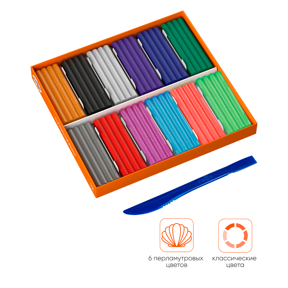 Уникальная серия пластилина «Оранжевое солнце» — это сочетание классических цветов и цветов с различными эффектами. В наборе 12 цветов: 6 классических и 6 цветов с эффектом перламутра. Уникальная цветовая палитра позволяет создавать эффектные поделки. У пластилина приятная текстура и высокая пластичность он хорошо держит форму и не крошится. Без выраженного химического запаха, не пачкает руки и рабочую поверхность. Пластиковый стек в комплекте.