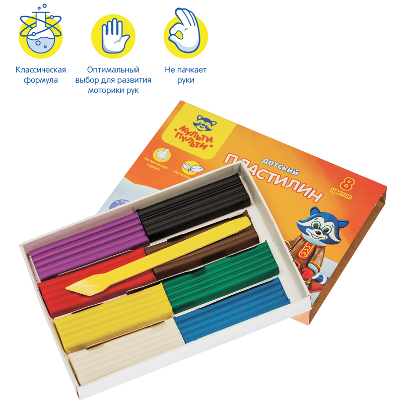 Пластилин Мульти-Пульти предназначен для лепки и моделирования. Не прилипает к рукам, имеет яркие, сочные цвета, которые легко смешиваются друг с другом. Для детей старше 3-х лет.