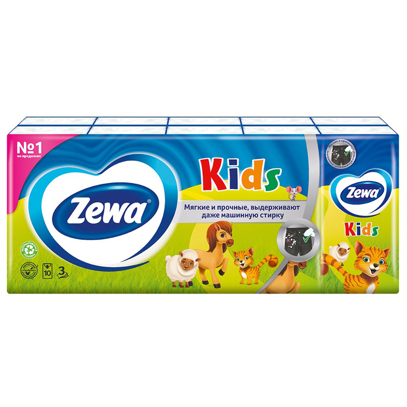 Детские бумажные неароматизированные платки Zewa. Одновременно сочетают в себе мягкость и прочность. Деликатно и нежно заботятся о Вашей коже. В пачке 10 платочков, в упаковке 10 пачек c детским дизайном.
