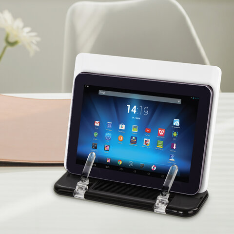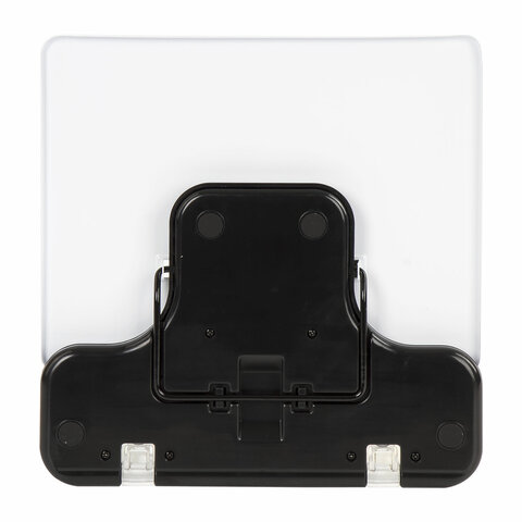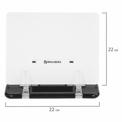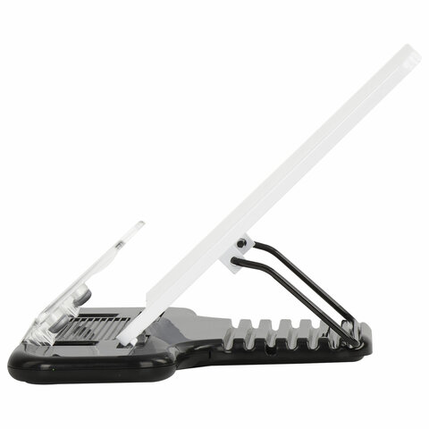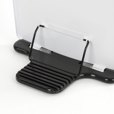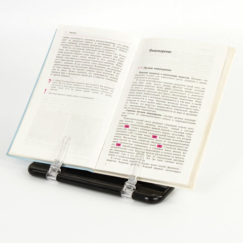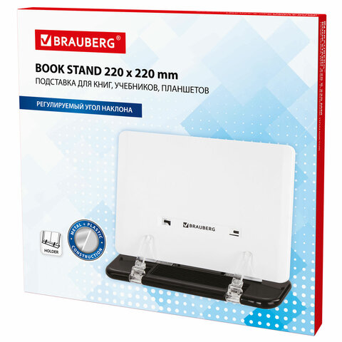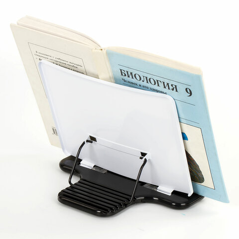 Регулируемый наклон подставки позволяет комфортно разместить книгу, журнал, или учебник на рабочем месте в вертикальном положении, обеспечивая удобство при чтении и работе с текстом. Пластина сделана из металла и способна удержать даже увесистые книги. Пластиковые держатели зафиксируют книгу снизу на выбранной странице. Размер подставки - 22х22 см.