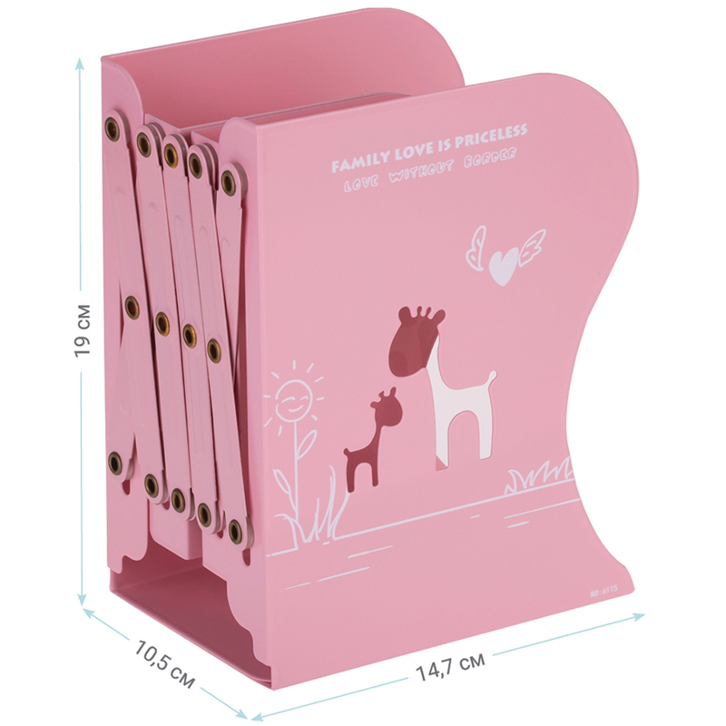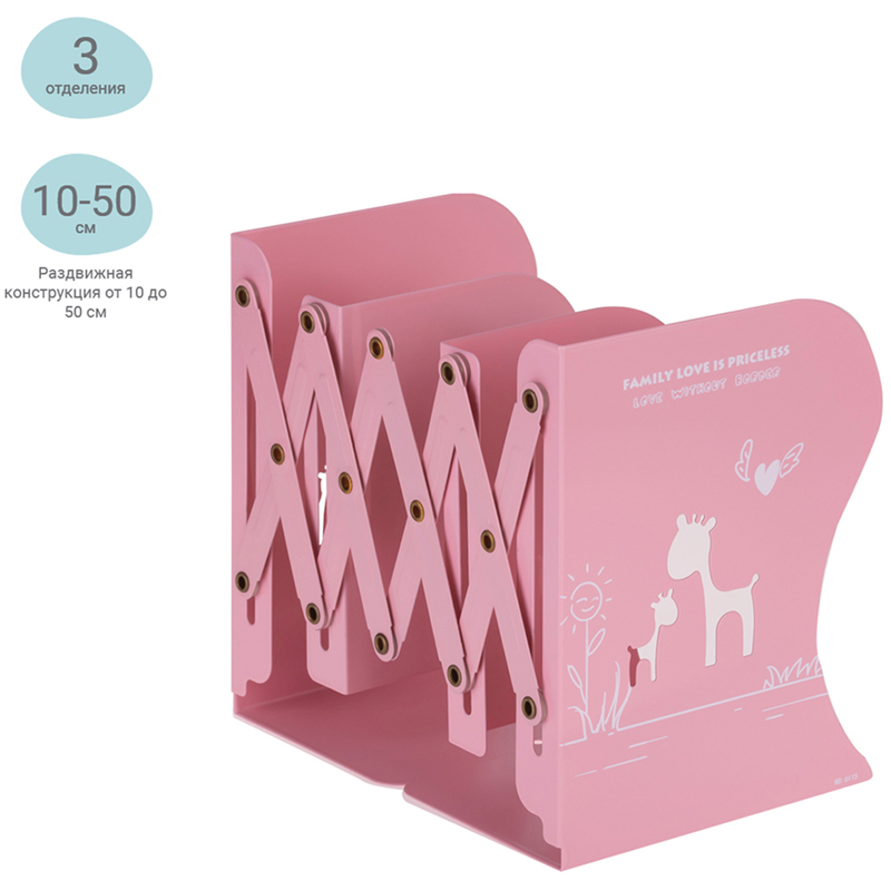 Подставка для книг MESHU с 3-мя отделениями представлена в розовом цвете с интересным дизайном. Металлический корпус в сложенном виде имеет габариты 19,0×14,7×10,5 см. Раздвижная конструкция от 10 до 50 см. Подставка упакована в картонную коробку.