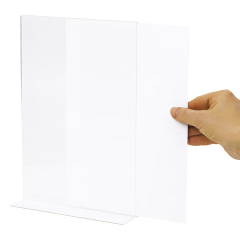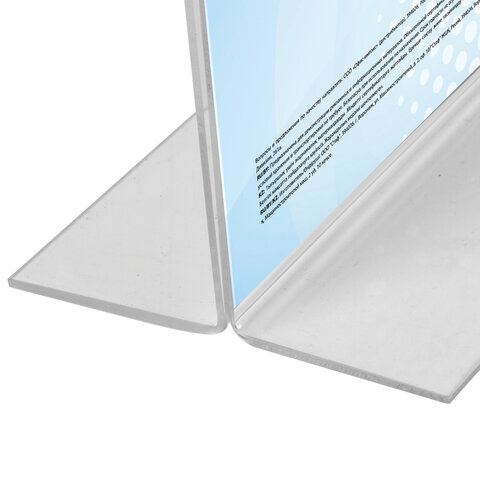 Изготовлена из прозрачного акрилового стекла. Предназначена для настольного размещения. Формат А4 и меньше. Максимальная высота вставляемого листа 297 мм, максимальная ширина вставляемого листа 210 мм. Упакована в полиэтилен.