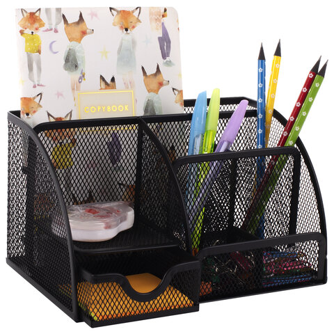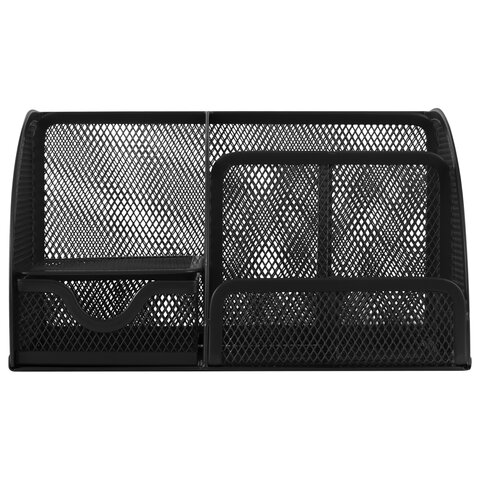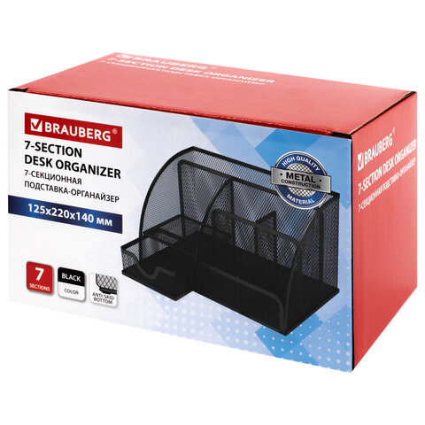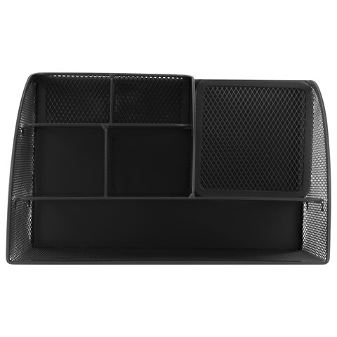 Изготовлена из металлической сетки. Имеет размеры 125х220х140 мм. Выполнена в черном цвете. Состоит из 7-ми секций, которые позволяют хранить и сортировать самые разные канцелярские принадлежности: от блоков для записей и кнопок - до ручек и карандашей. Мягкие подушечки на дне предотвращают скольжение и порчу мебели. Поставляется без канцелярского наполнения.