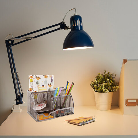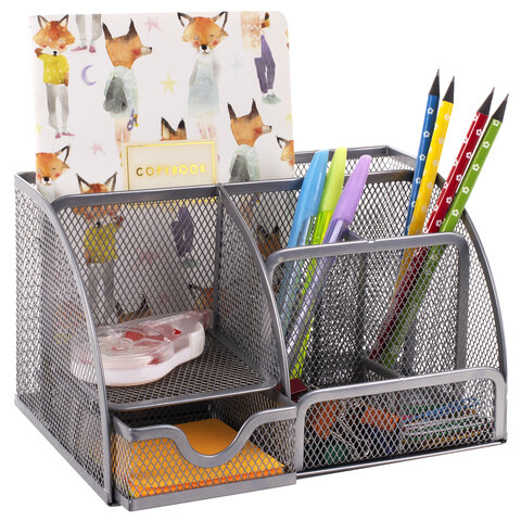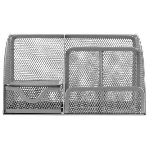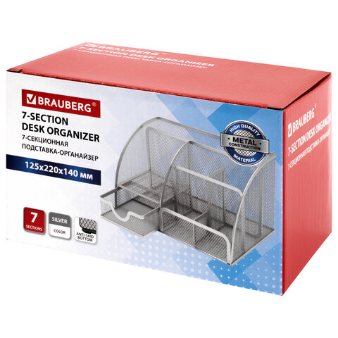 Изготовлена из металлической сетки. Имеет размеры 125х220х140 мм. Выполнена в серебристом цвете. Состоит из 7-ми секций, которые позволяют хранить и сортировать самые разные канцелярские принадлежности: от блоков для записей и кнопок - до ручек и текстовыделителей. Мягкие подушечки на дне предотвращают скольжение и порчу мебели. Поставляется без канцелярского наполнения.