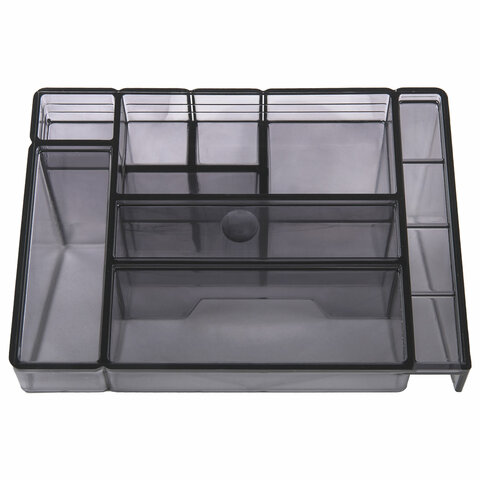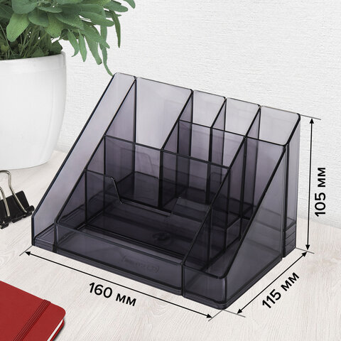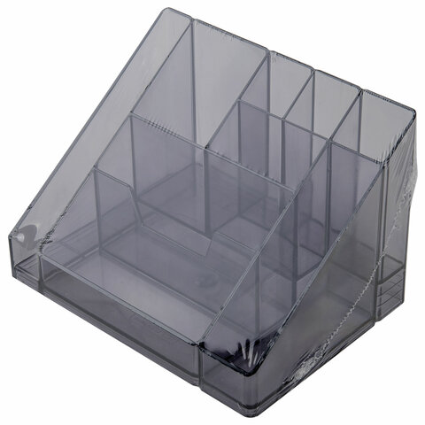 Изготовлена из высококачественного пластика. Имеет размеры 115х160х105 мм. Состоит из 9-ти отделений для канцелярских мелочей и пишущих принадлежностей. Поставляется без наполнения.