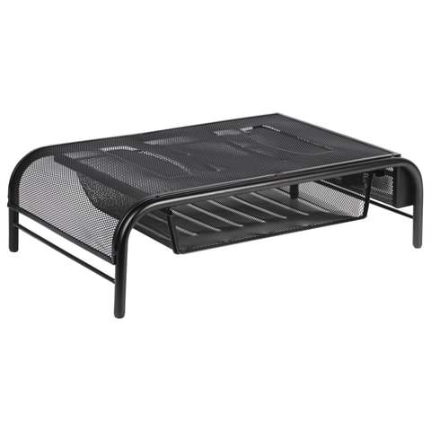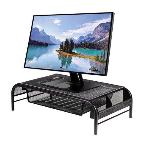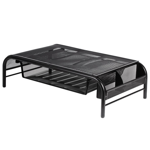 Подставка снабжена лотком для бумаг и документов, а также двумя отделениями для канцелярских мелочей. Жесткая конструкция из металлической сетки выдерживает нагрузку до 5 кг. Сетчатое строение не препятствует притоку воздуха, благодаря чему снижается риск перегрева дорогостоящей техники.