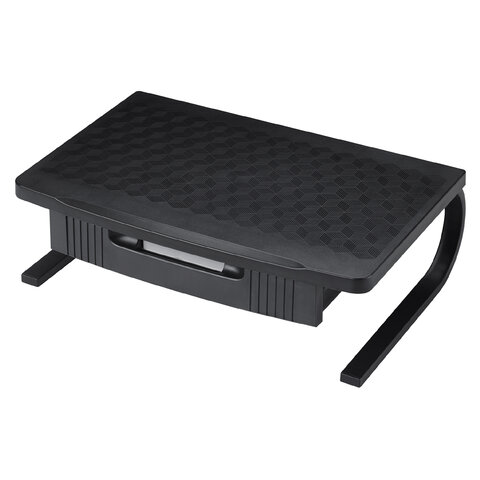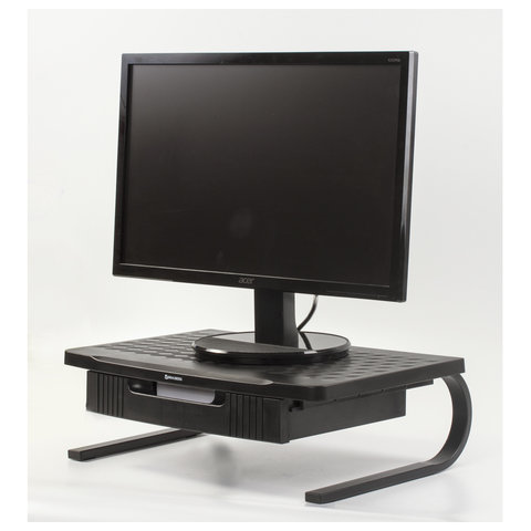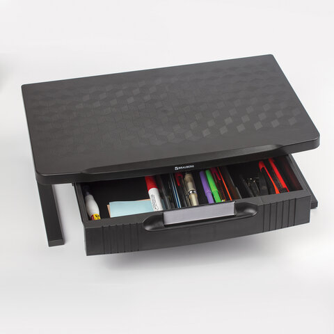 Размер подставки: 46х30х14,5 см. По центру расположен выдвижной ящик для канцелярских принадлежностей. Основание выполнено из металла.