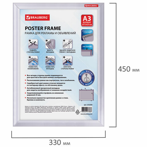 Настенная рамка BRAUBERG актуальна для рекламных носителей, объявлений и документов, требующих частой замены.