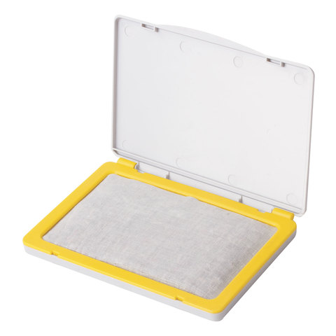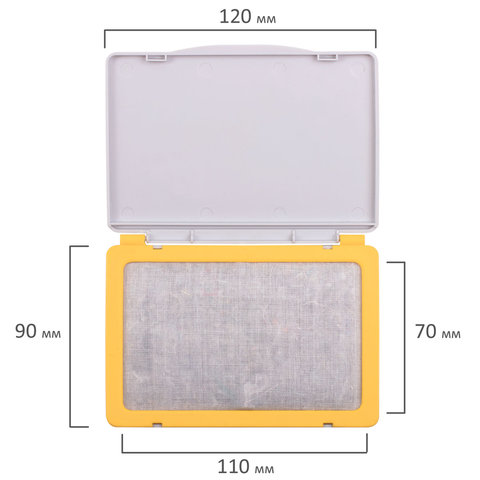 Неокрашенная штемпельная подушка. Крышка пластикового корпуса коробочки закрывается плотно, препятствуя испарению влаги. Размер - 120х90 мм, рабочая поверхность - 110х70 мм.