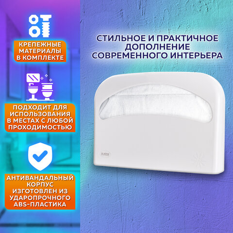 Изготовлен из ударопрочного ABS-пластика и позволяет использовать 1 пачку гигиенических покрытий 1/2 сложения. Размер диспенсера - 405х50х275 мм. Идеально сочетается с расходными материалами других производителей. В комплект входят крепежные материалы для установки. Обладает функциональностью и стильным дизайном, отлично впишется в любой интерьер туалетных комнат. Отвечает всем требованиям гигиены.